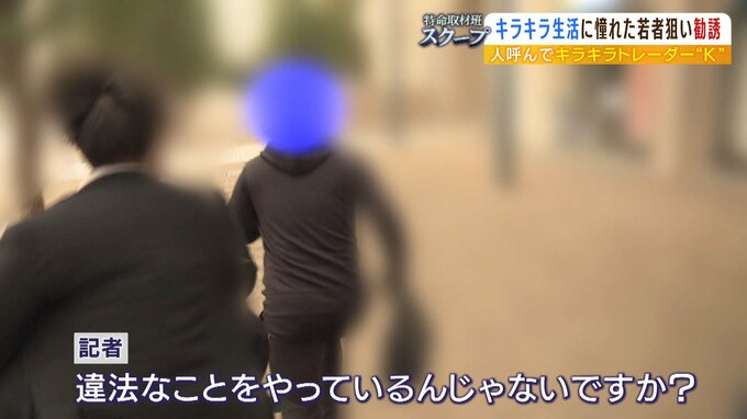 (記者)「あなたがやっていることは違法ですよね?違法なことをやっているんじゃないですか?消費者センターも数十件の相談が来ていると言っているんですけど。答える責任があるんじゃないですか。あなたのインスタグラム見ていますよ。人から集めた金で…。答えてください。説明してくださいよ」