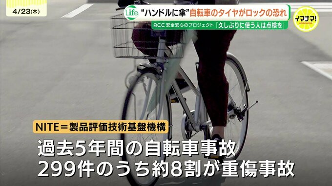 走行中、突然前輪が止まり、激しく転倒する自転車。NITE=製品評価技術基盤機構によりますと、過去5年間に報告のあった事故299件のうち、およそ8割で重傷となっています。