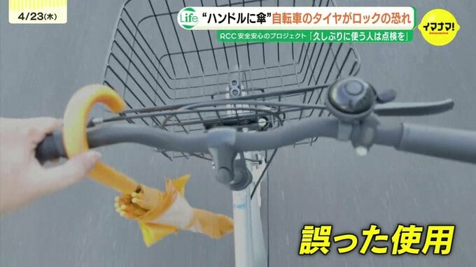 こうした違反を避けようと、ハンドルに傘をぶら下げて運転していないでしょうか。ぶら下げた傘が、前輪のスポークに挟まると、瞬時にタイヤがロックし、体が地面に投げ出される恐れがあります。