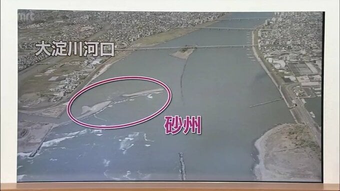 宮崎市の大淀川の河口を空から撮影した画像ですが、この部分、砂が堆積した砂州があります。