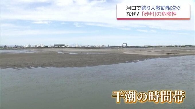 水位の低い干潮の時間帯、現場となった砂州は広い面積があり、川岸からもつながっています。