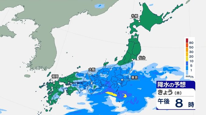 木曜日夜は、近畿から関東では雨が続き、伊豆諸島で激しい雨が降る所があるでしょう。