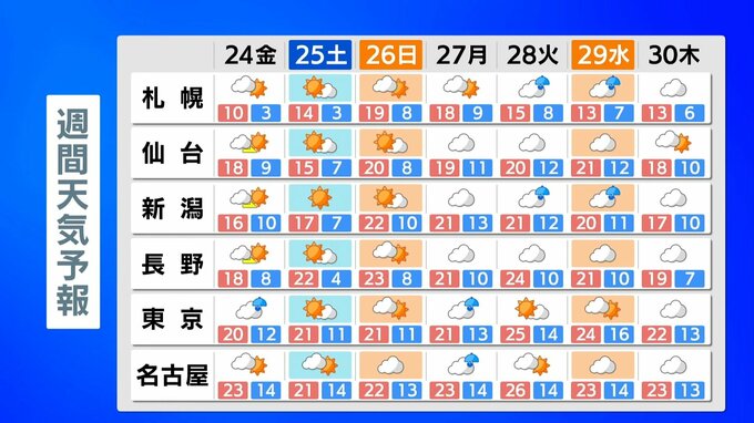 土曜日にかけて広い範囲で晴れますが、日曜日は太平洋側を中心に雨が降るでしょう。月曜日・火曜日は日差しが届き、25℃以上の夏日の所もある予想です。