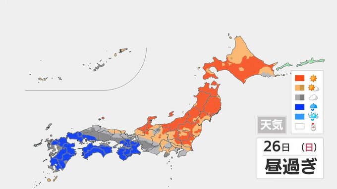 日曜日は西日本では雨が降りますが、関東・北陸から北海道は夕方にかけて広く晴れる見込みです。東海地方は日曜日の夜には雨が降り出しそうです。