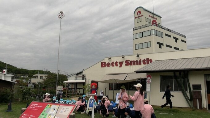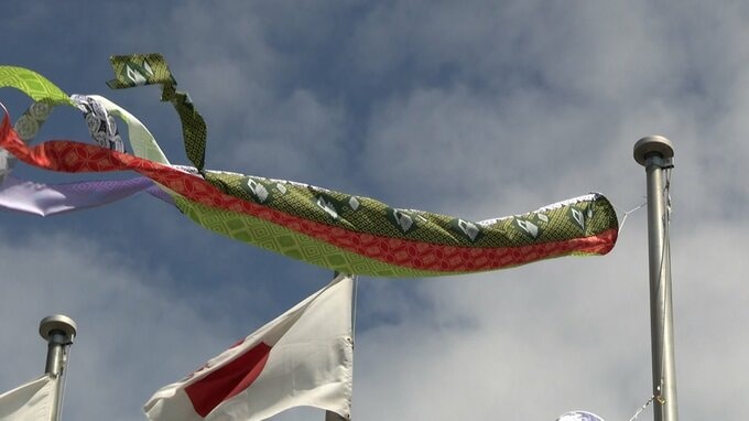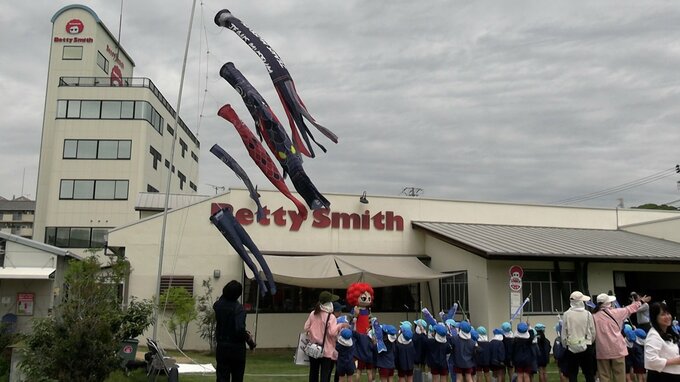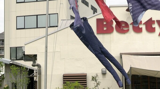1962年に創業したジーンズメーカー「ベティスミス」では、地元のこども園の園児を招き、「デニム柄こいのぼり」を掲げました。