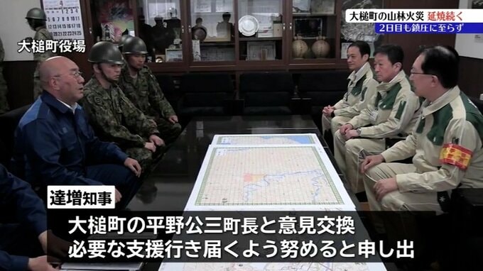 延焼範囲や避難指示の拡大を受け、達増知事は22日大槌町を訪れ、平野公三町長と意見交換しました。