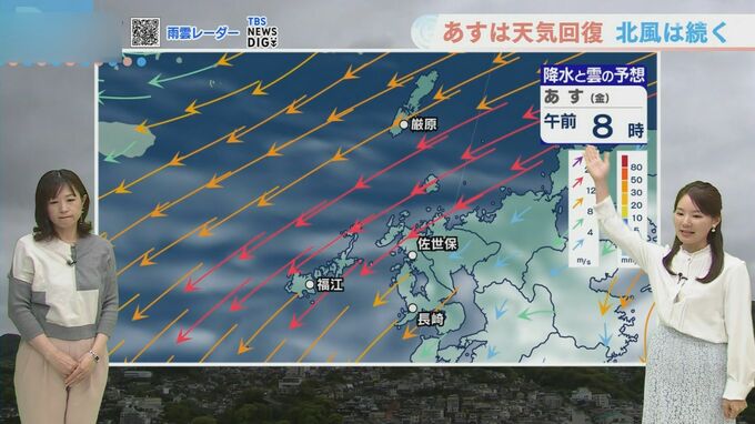 あす24日(金)は、雨をもたらした低気圧が離れ、高気圧に覆われる見込みです。天気は回復へと向かいますが、北風は引き続き残りそうです。壱岐・対馬・五島など県の島嶼(とうしょ)部や北部では、風の強い状況が続くでしょう。