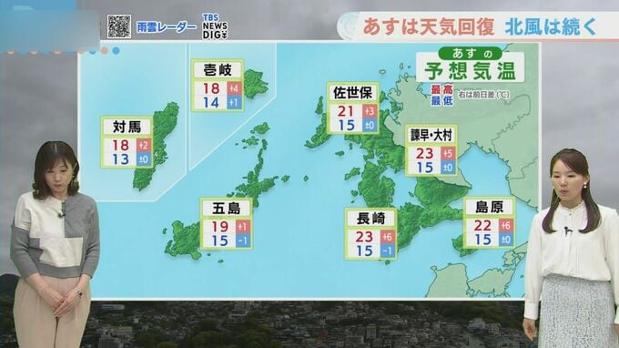 予想気温は最低13℃から15℃、最高18℃から23℃。南部では日差しと心地よい風で過ごしやすい体感となりそうです。一方、壱岐・対馬・五島では最高気温が20度に届かない予想で、北風が吹き抜けるため、日中も上着があってちょうどいいかもしれません。