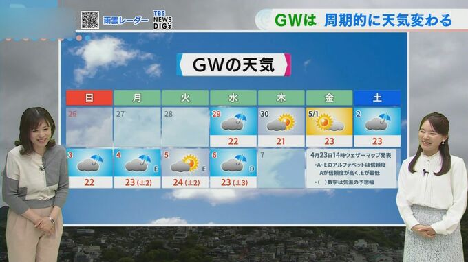 ゴールデンウィークは、晴れと雨が周期的に繰り返す見通しです。傘マークが並ぶ日もありますが、「一日中雨が降るわけではない」とのことで、晴れ予想が増えてくる可能性があります。