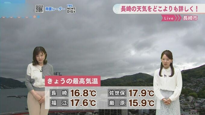 きょう23日(水)の長崎は厚い雲に覆われ、日差しが届きませんでした。各地の最高気温は長崎16.8℃、佐世保17.9℃、福江17.6℃、厳原15.9℃と、いずれも20度を下回り、「3月下旬から4月上旬並み」の気温となりました。雨や北風の影響もあり、ひんやりとした1日でした。