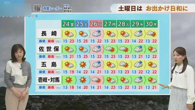 あさって25日(土)はよく晴れ、お出かけ日和となりそうです。長崎・佐世保では最高気温が25℃と、「夏日」となる見込みです。きょうひんやりした分、土曜日は急に暑く感じる可能性があります。水分補給を忘れず、上着の中は半袖にするなど服装で調節を。日よけ対策もお忘れなく。