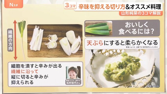 …細胞を潰すと辛みが出るため繊維に沿って縦に切ると辛みが抑えられる(野菜ソムリエの松村さんによると)