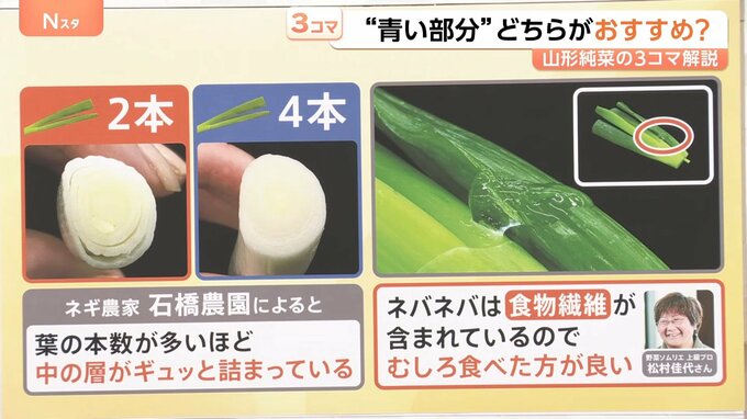 …青い部分である葉の本数が多いほど中の層がギュッと詰まっているため(ネギ農家の石橋農園によると)