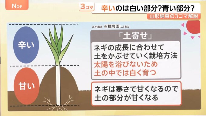 …白い部分はネギの成長に合わせて5、6回土をかぶせていく栽培方法「土寄せ」で人為的に作られる。ネギは寒さで甘くなるため、土の中にある白い部分が甘くなる。(ネギ農家の石橋農園によると)