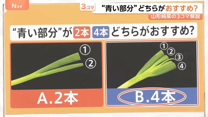 “青い部分”を美味しく食べるには、天ぷらにしたり、煮物やスープに入れたりすると柔らかくなるとのことでした。