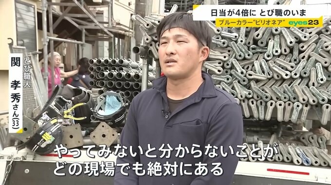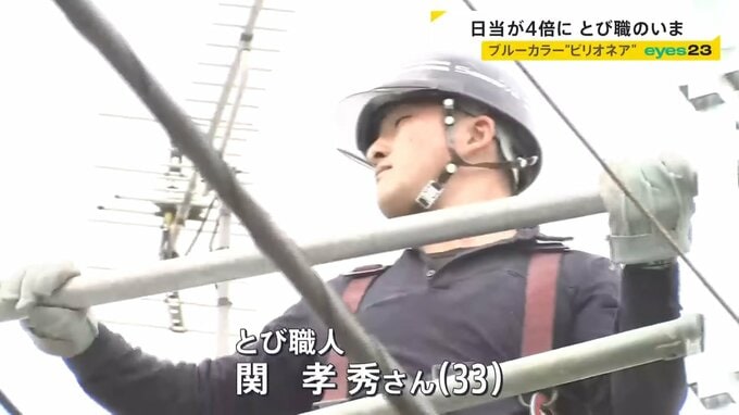 都内の住宅で足場を組む「とび職人」の関孝秀さん(33)。16歳でこの世界に飛び込みました。当時の日当は6000円ほどだったといいますが・・・