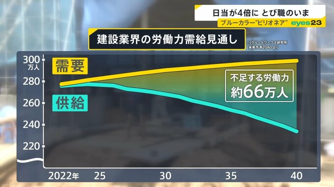 建設業の労働需給は需要に対して供給が足りておらず、リクルートワークス研究所のシュミレーションでは、2040年には約66万人の労働力が不足する見通しだといいます。