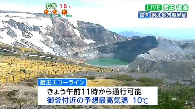 蔵王エコーラインは冬季閉鎖を終え、24日午前11時から一般車両の通行が可能となりました。御釜付近のライブカメラには晴れた様子が映っています。ただし、御釜付近の予想最高気温は10℃程度にとどまります。山の上に出かける方は、冬物の上着を必ずお持ちください。
