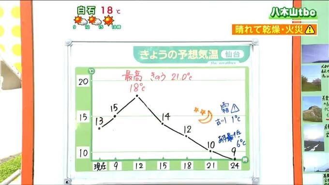 24日夜は放射冷却が進み、25日の朝の最低気温は仙台で6℃の見込みです。内陸の大崎・古川では1℃まで下がる予想で、24日朝より3℃前後低くなりそうです。