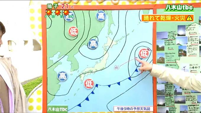 県の南部に雨を降らせた低気圧、現在(24日午前7時43分時点)はこの辺にありまして、このあと足早に東のほうに離れていきます。大陸のほうからは高気圧が張り出してきますので、現在薄い雲が出ているところも、昼頃からはよく晴れるでしょう。