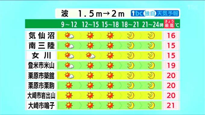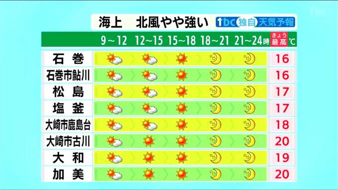大崎や栗原など内陸部は冷たい海風が届かず、最高気温は20℃前後まで上がる見込みです。夜は放射冷却が進み、25日朝の気仙沼では最低気温が2℃まで下がりそうです。