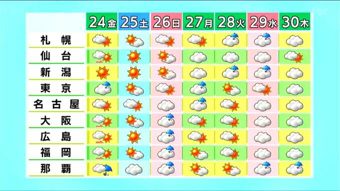 気象庁発表の全国週間予報では、日曜日に西日本から雨が降り始め、月曜日は東日本を中心に雨、火曜・水曜は北日本で雨が降りやすくなるとしています。