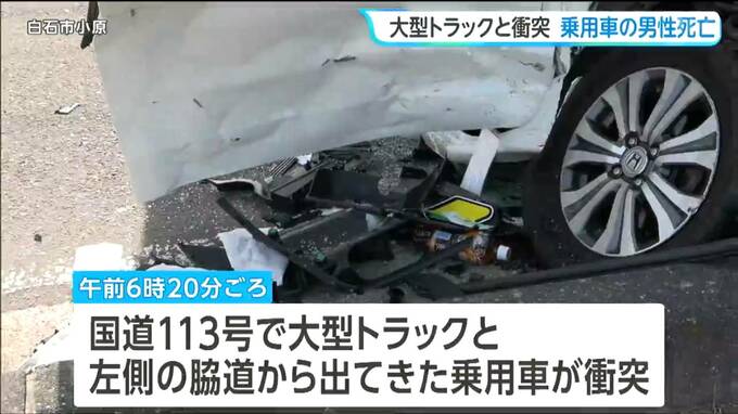 24日朝、宮城県白石市内の国道で大型トラックと脇道から出てきた乗用車が衝突し乗用車の男性が死亡しました。