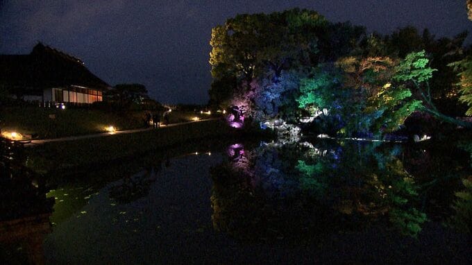 また、延養亭の南に位置する二色が岡は昨年、景観復元事業が完了し、ライトアップに加わりました。水面に鏡のように映った木々を楽しむことができます。