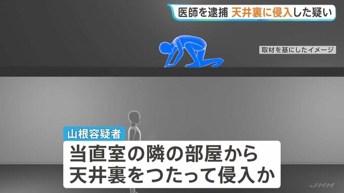 山根容疑者は当直室の隣の部屋から天井裏をつたって侵入したとみられていて、取り調べに対し、容疑を認めているということです。