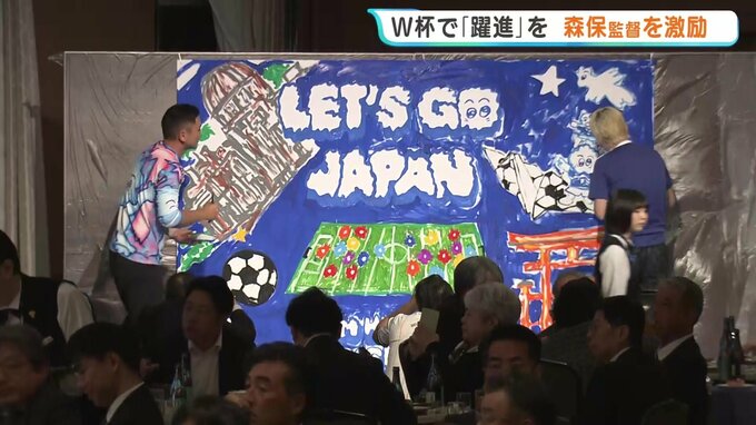 会ではライブペイントなども披露され盛り上がりをみせました。そして、森保監督らへ必勝祈願として「躍進」と書かれた大しゃもじが贈られました。