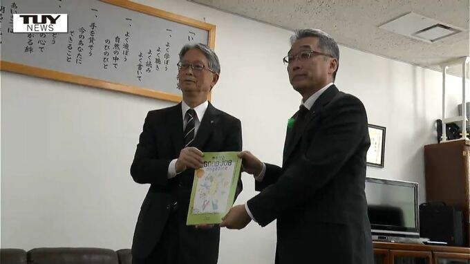 山形市の出版社が山形県内企業の魅力を紹介するキャリアハンドブックを作り、県内すべての中学2年生に配布されました。けさ県庁では、青陵社の佐竹純一社長から須貝英彦教育長へハンドブックが手渡されました。『…