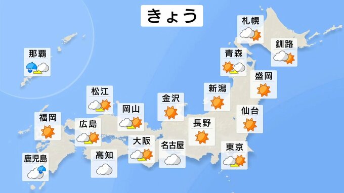 きょう24日(金)午後は九州北部から北陸、関東甲信、東北を中心に晴れる見込みです。黄砂や花粉は少なく、洗濯日和でしょう。風は強めに吹きますので、洗濯物は飛ばされないようお気をつけください。沖縄、九州南部から東海付近、そして北海道ではにわか雨がありそうです。