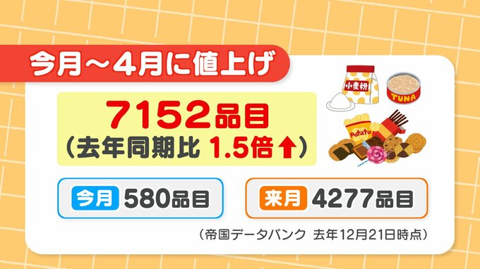 今年はどうなるかというと、1月から4月に値上げが予定されている食品や飲料は7152品目で、これは去年の同じ時期に比べておよそ1.5倍に増えています。