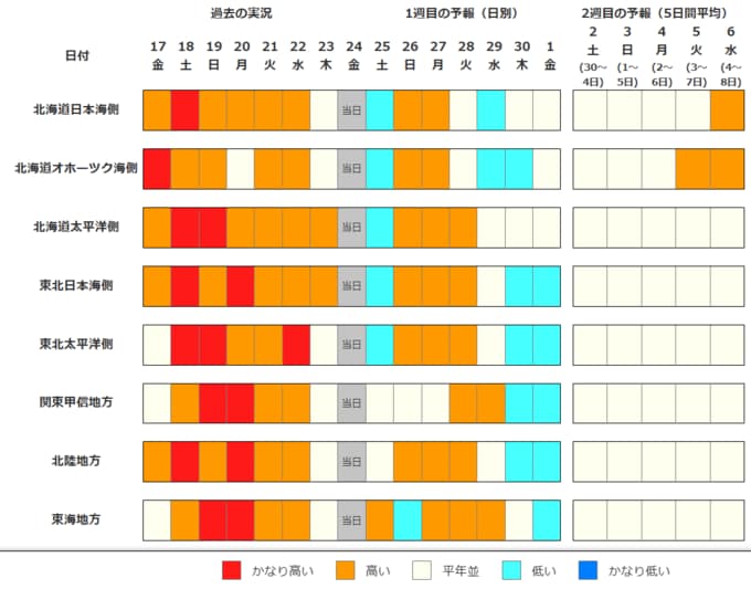 ・2週目の予報は中心の日に前後2日間を加えた5日間の平均(平均気温の5日間平均)です。平均期間は中心の日の下に表示しています。2週目のかなり高い(かなり低い)は、かなり高い(かなり低い)気温となる確率が30%以上のときに表示します。