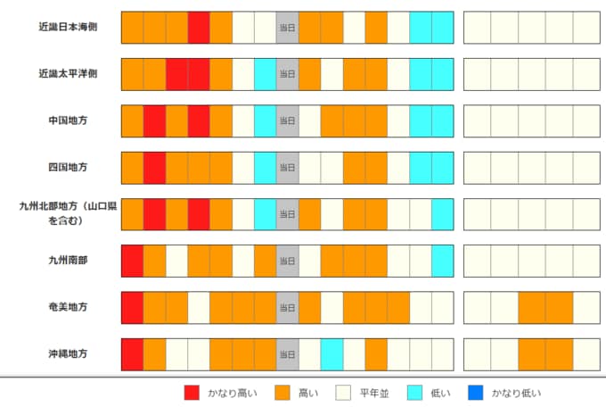 北・東・西日本の気温は、向こう4日間程度は高い日が多いでしょう。4月29日から5月1日頃にかけては平年並か低い日が多いですが、その後は平年並の日が多いでしょう。沖縄・奄美の向こう2週間の気温は、平年並か高い日が多いでしょう。