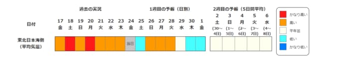 ・2週目の予報は中心の日に前後2日間を加えた5日間の平均(最高気温の5日間平均、最低気温の5日間平均、平均気温の5日間平均)です。平均期間を中心の日の下に表示しています。2週目のかなり高い(かなり低い)は、かなり高い(かなり低い)気温となる確率が30%以上のときに表示します。