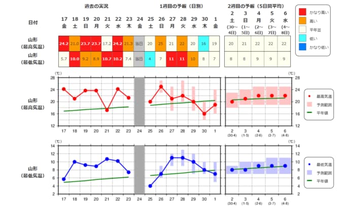 ・最近1週間の実況と今後2週間先までの気温の推移を表示しています。