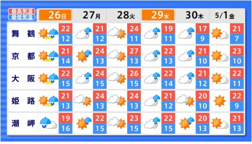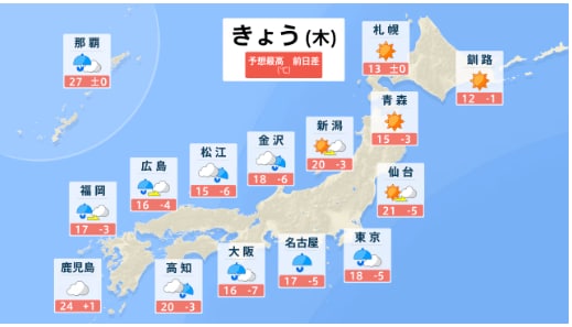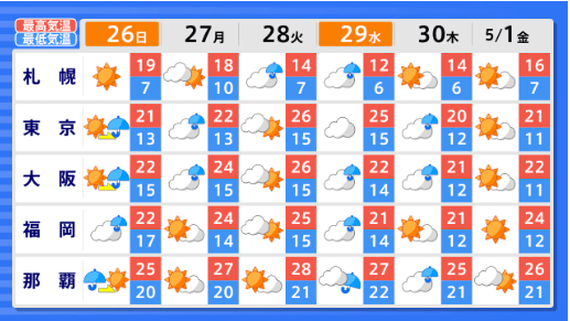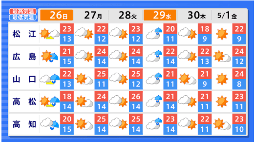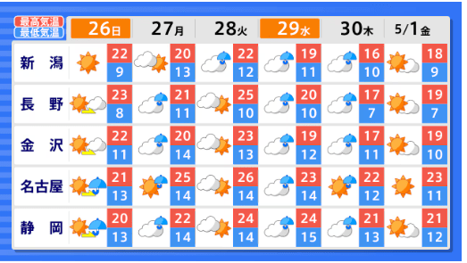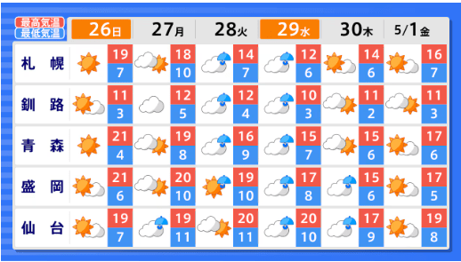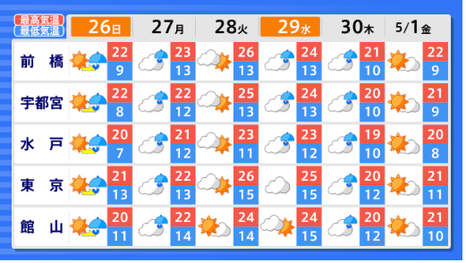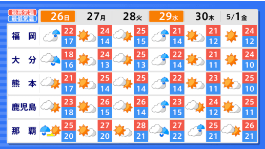 【2週間気温予報】北・東・西日本の気温は向こう4日間程度は高い日が多い予報 その後は平年並の日が多い予報 今後の全国の天気を画像で 気象庁 テレビユー山形 2026年4月24日(金) 14:59 国内 ■全国の天気を地方ごとに(画像) 画像はTBS NEWS DIG Powered by JNNより 画像ありの記事を最初から https://newsdig.tbs.co.jp/articles/-/2623212?display=1