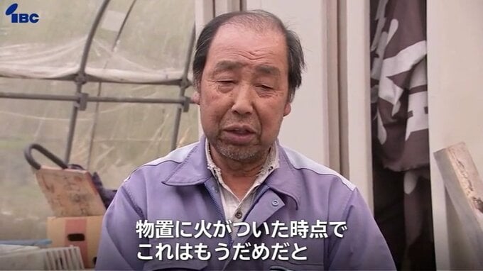 「物置に火が着いた時点で、これはだめだと、妻に車2台あったのをこれだけでも(逃がそうと)。半分が2階建てだったんだけども、それが崩れるのを見たとき(絶句)」