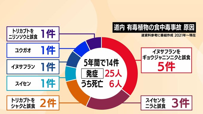 道内では、有毒植物を誤って食べてしまったことによる食中毒事故、2021年から今日までで14件起きています。最も多いのがイヌサフランをギョウジャニンニクと誤って食べてしまった5件。そしてこの5年間で、6人が亡くなっています。