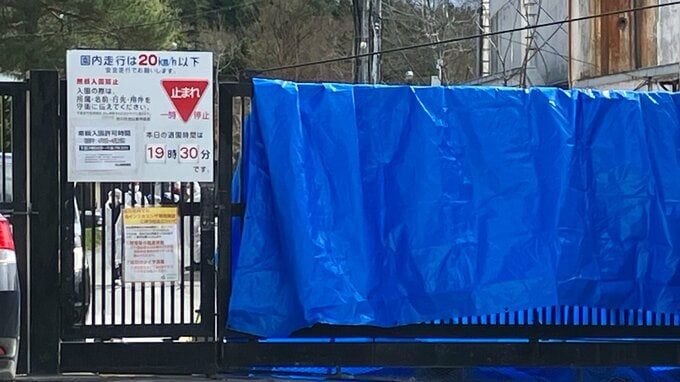 「ブルーシートの奥で、警察の鑑識作業が行われています」