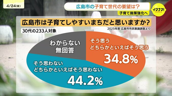 広島市が去年実施した調査によりますと、この質問に対して、子育て世代の30代では「そう思う」と「どちらかといえばそう思う」と答えた人が34.8%だったのに対し、「そう思わない」「どちらかといえばそう思わない」と答えた人は44.2%にのぼりました。