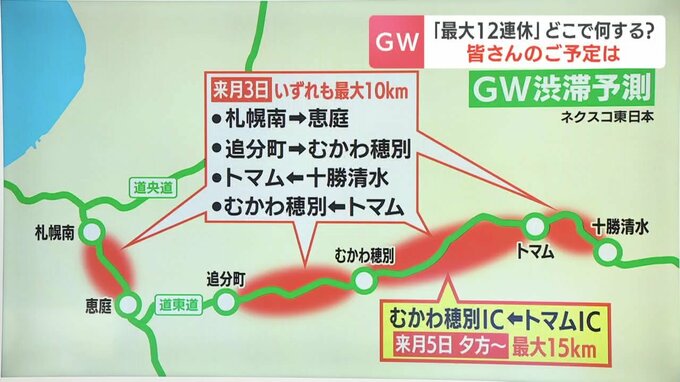 道東道のトマムからむかわ穂別で最大15キロの渋滞が予測されているということです。