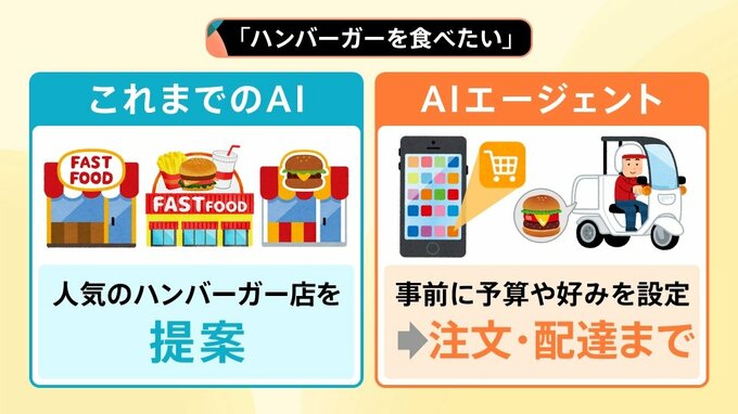 “AIエージェント”では、事前に予算や好みを設定・学習させておけば、注文や配達という行動にまで繋がっていくのではないかということです。