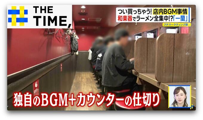 歌は入っていない和楽器を使ったしっとりした曲調で、カウンターの仕切りと組み合わせることで、“よりラーメンの味に集中”しやすくしているとのこと。