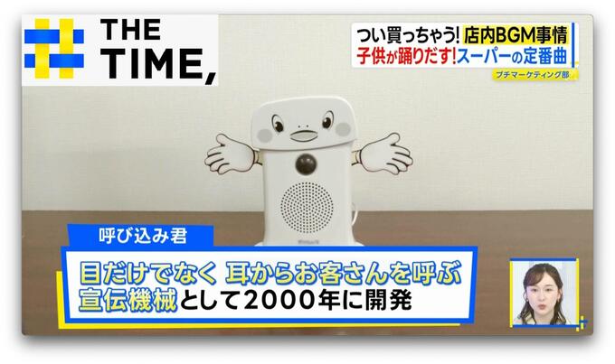 スーパーでこのメロディーが流れている場所にあったのは、カワイイ顔がついた小さな機械、その名も「呼び込み君」。実は♪<ポポーポ ポポポ>という曲は、呼び込み君に元々入っている音源なのです。