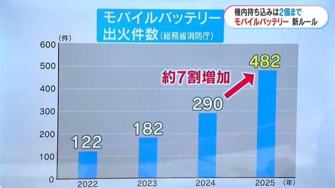モバイルバッテリーの出火が増えているんです。総務省消防庁の発表によると出火件数は年々増加し、去年は482件で前の年から7割ほど増加しています。それに伴い、事故も相次いでいます。