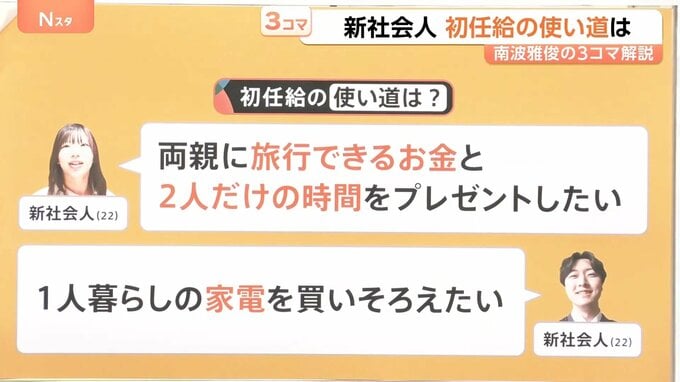 初任給の使い道について22歳の新社会人に聞いてみると、「両親に旅行ができるお金と2人だけの時間をプレゼントしたい」「1人暮らしの家電を買いそろえたい」というような声がありました。