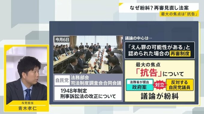 今、再審制度を見直す刑事訴訟法の改正案をめぐり、自民党内では怒号が飛び交う前例のない事態となっている。最大の焦点は「検察の抗告権」の扱い。全面禁止を求める有志の議員と、認めることはできないと主張する法務省側。その背景、それぞれの主張の根拠、そして落としどころはどこにあるのかを、最前線で取材を続ける記者2人が解説する。
