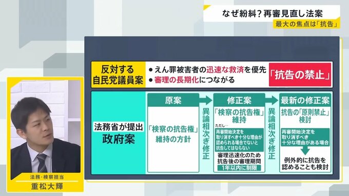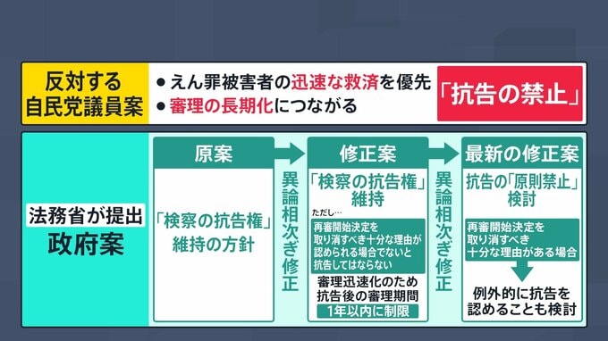 法務省が当初提出した原案では、検察の抗告権は全面的に維持されていた。しかし自民党内の会議で異論が相次ぎ、法務省は修正を迫られることになった。